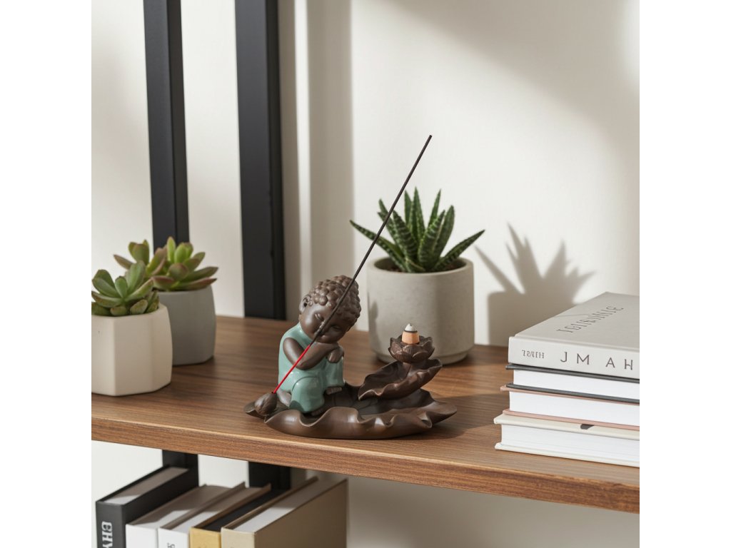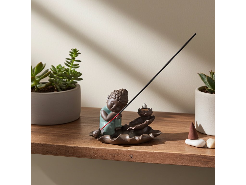 Krásná, originální, keramická Soška Buddha na listu držící tyčinku/ vonný kužel. Vhodné na pálení vonných tyčinek a Kuželů. Lze použít i jako originální dekoraci do interiéru, na parapet, polici, balkon apod.
