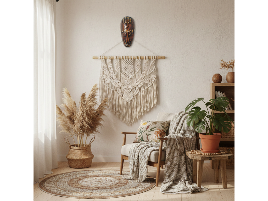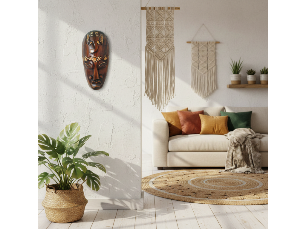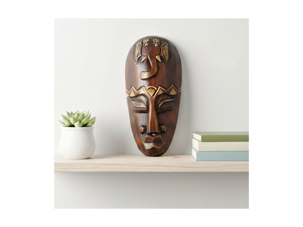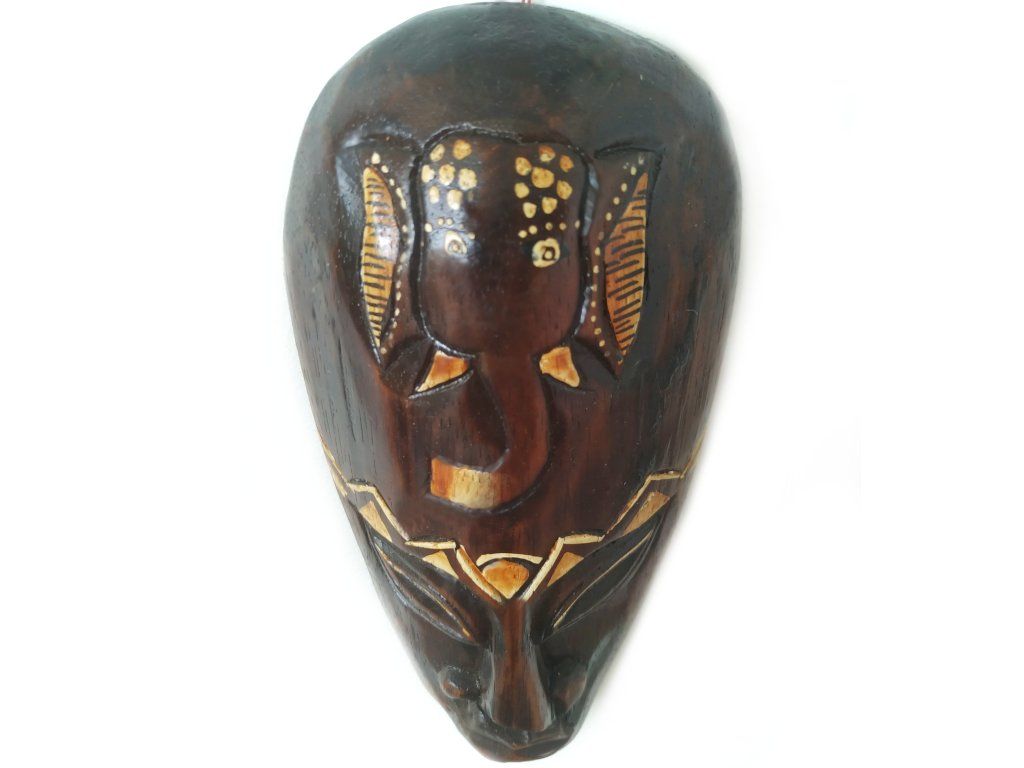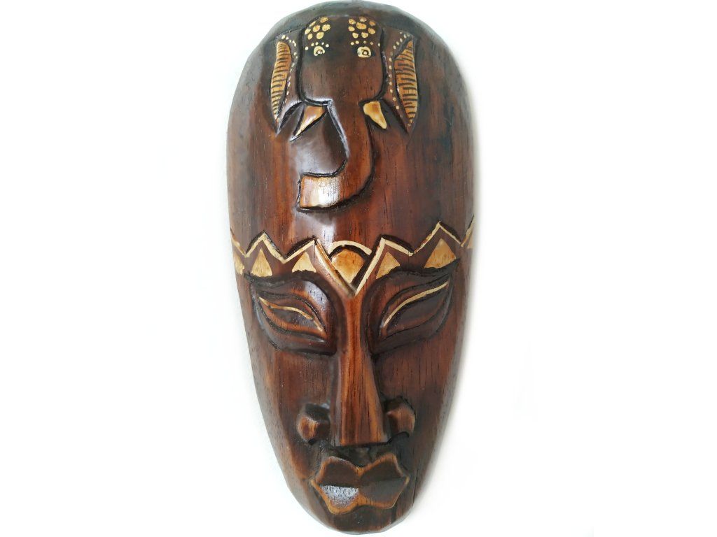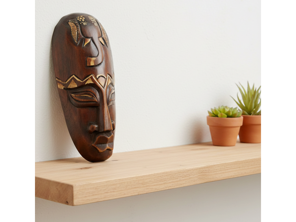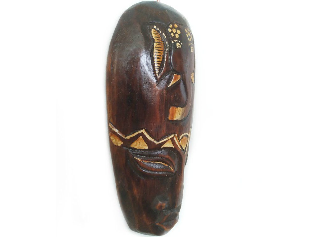 Krásná menší Dřevěná Ručně řezbovaná Maska - dekorace k zavěšení na stěnu / polici.