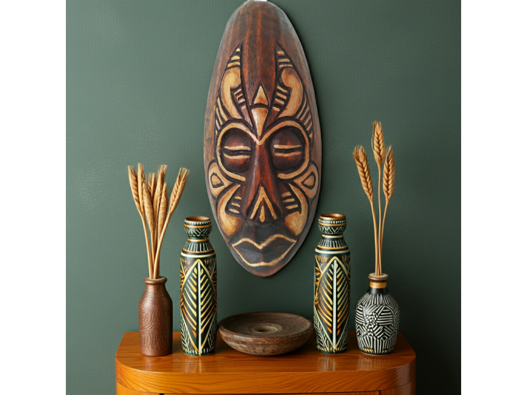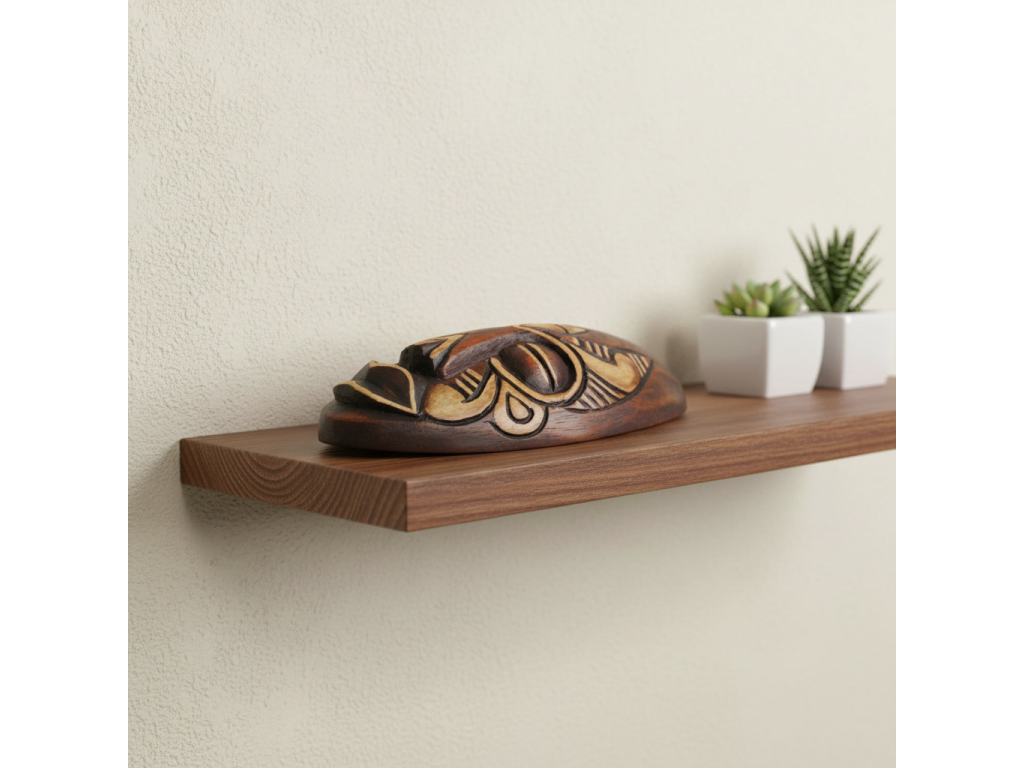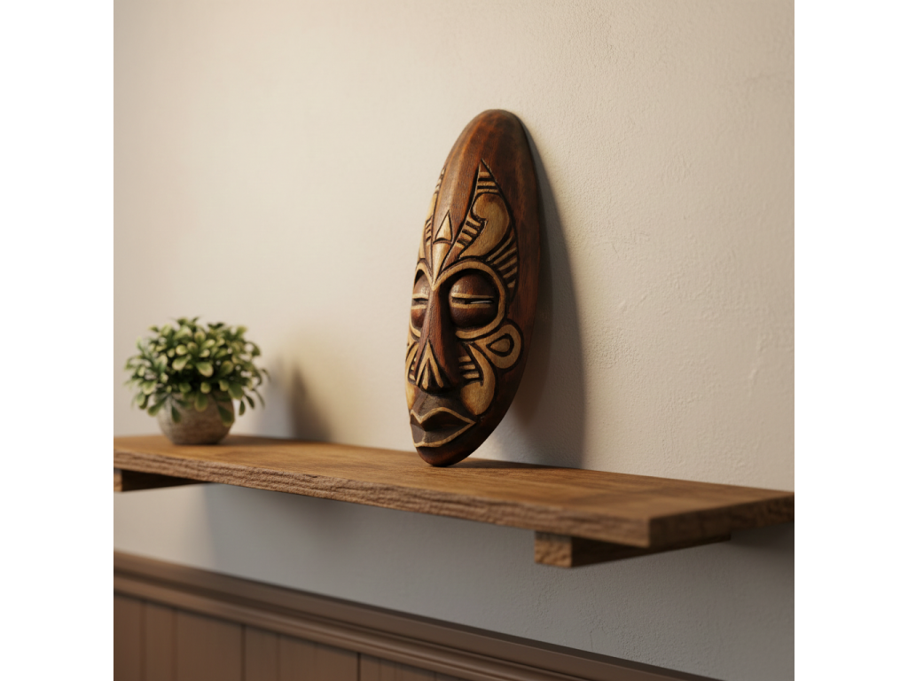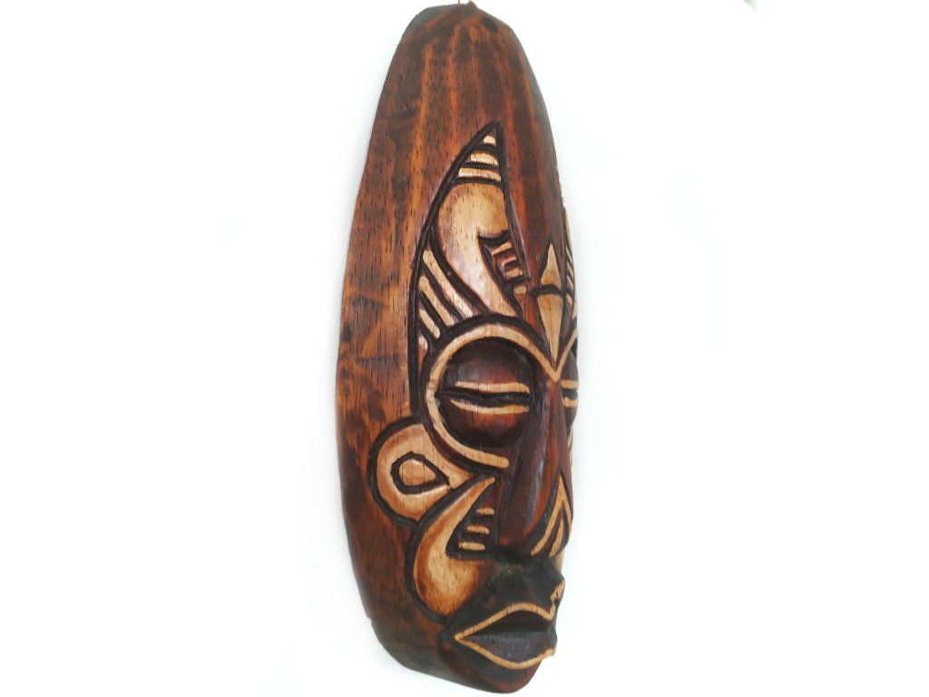 Krásná menší Dřevěná Ručně řezbovaná Maska - dekorace k zavěšení na stěnu / polici.