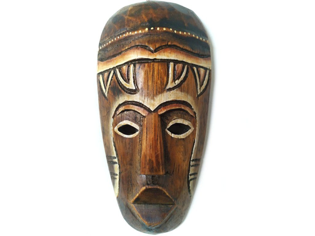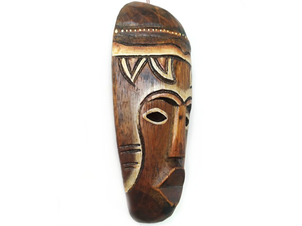 Krásná menší Dřevěná Ručně řezbovaná Maska - dekorace k zavěšení na stěnu / polici.