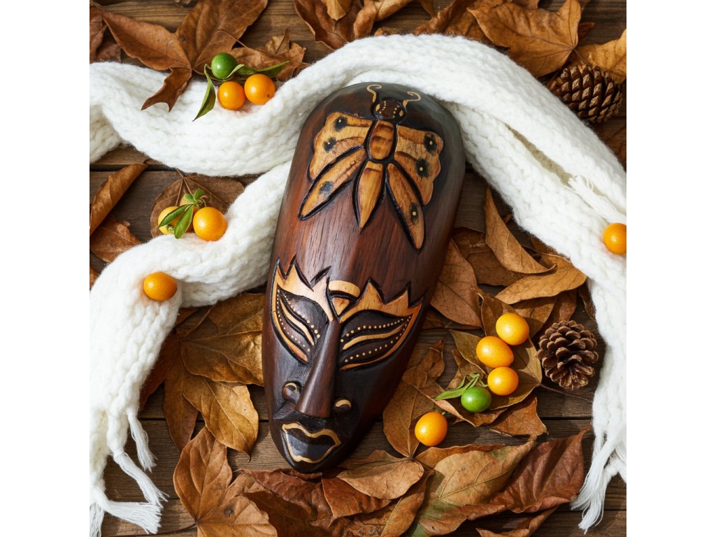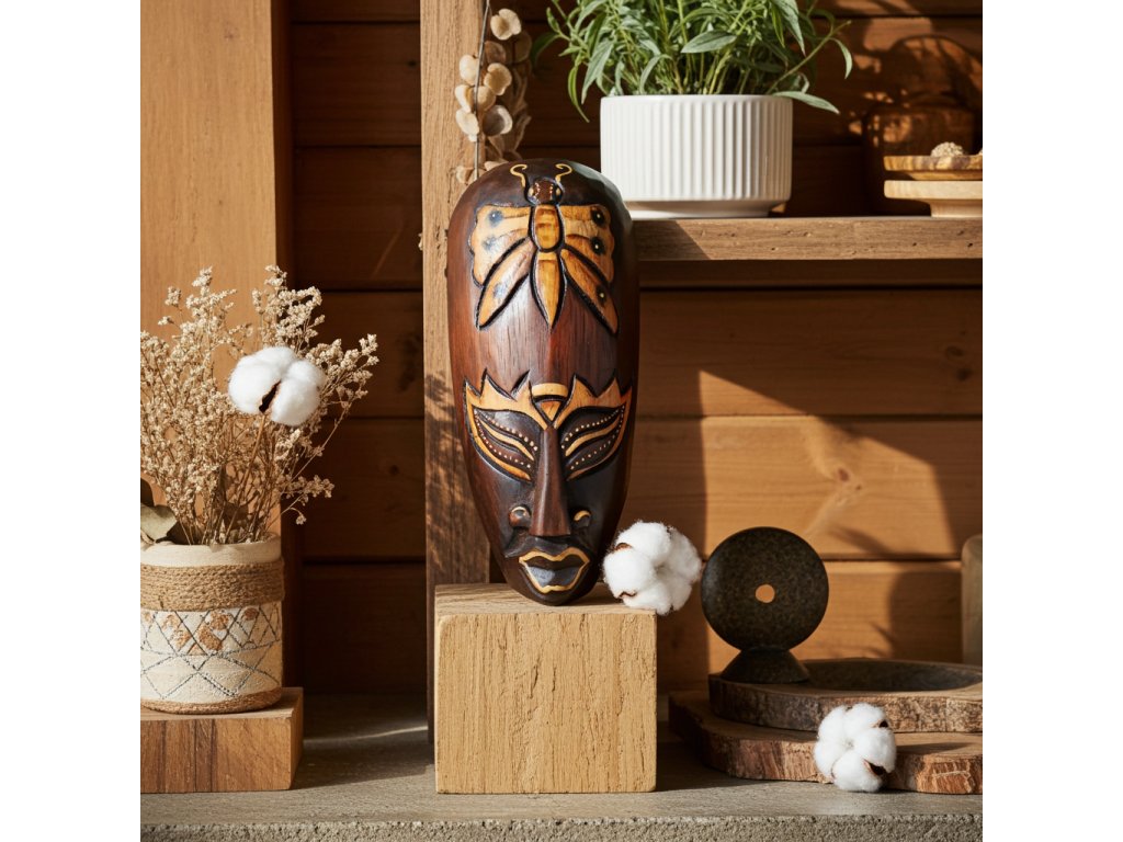 Krásná menší Dřevěná Ručně řezbovaná Maska - dekorace k zavěšení na stěnu / polici.