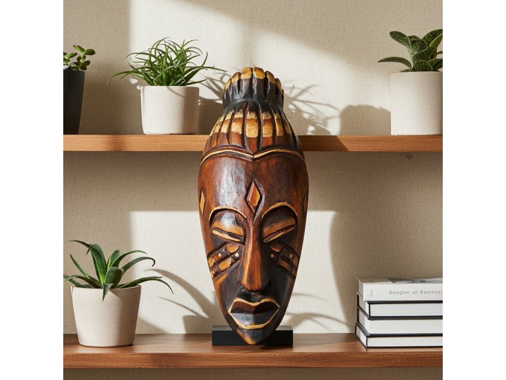 Krásná menší Dřevěná Ručně řezbovaná Maska - dekorace k zavěšení na stěnu / polici.