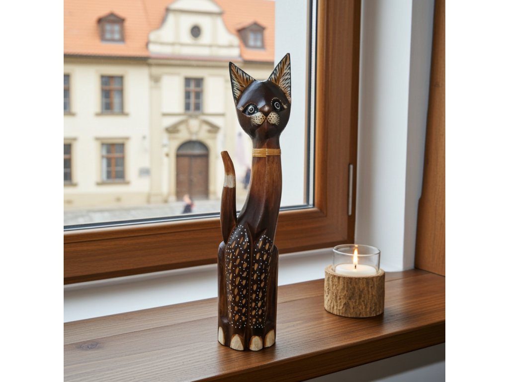 Krásná větší Dřevěná ručně řezbovaná socha Kočka.