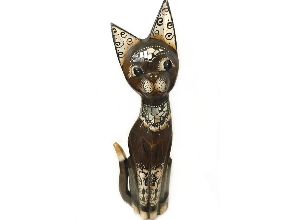 Krásná Dřevěná ručně řezbovaná socha Kočka.