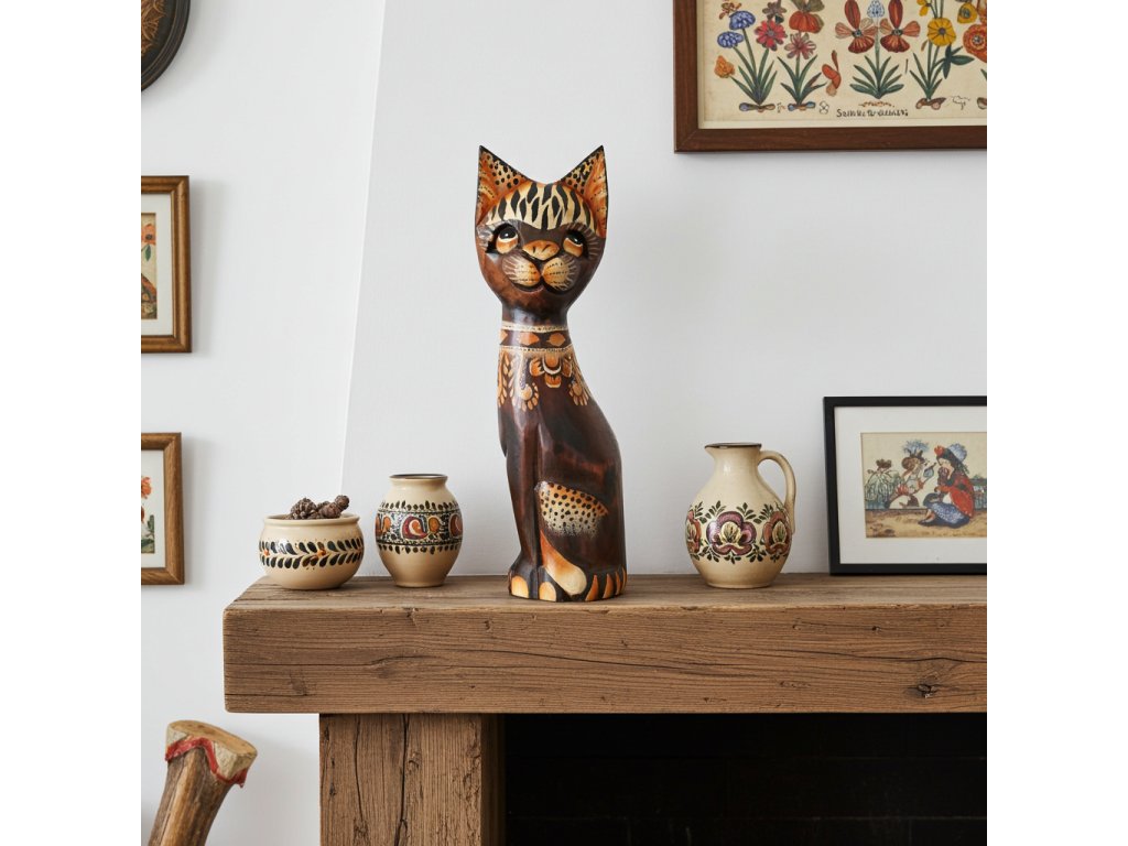 Krásná Dřevěná ručně řezbovaná socha Kočka.