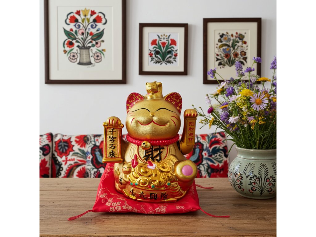 Velmi oblíbený a účinný Symbol Feng Shui na přilákání Bohatství, Přátel a obchodních příležitostí. Kočka má pohyblivou ruku a může tímto vítat Vaše návštěvy a zákazníky.