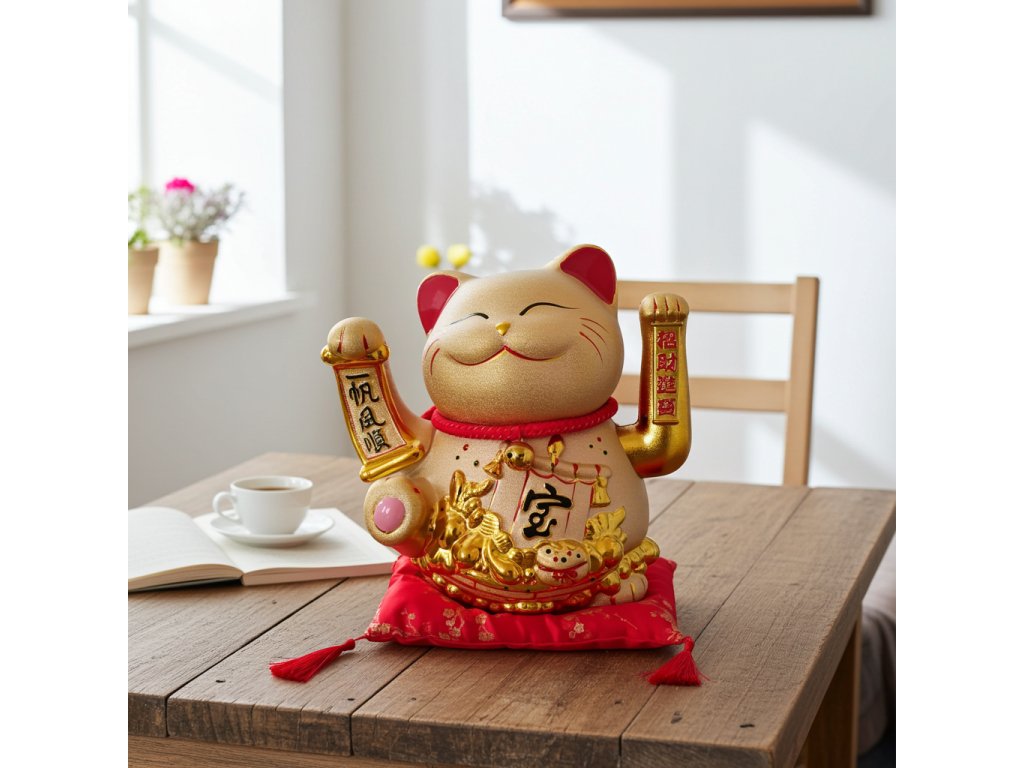 Velmi oblíbený a účinný Symbol Feng Shui na přilákání Bohatství, Přátel a obchodních příležitostí. Kočka má pohyblivou ruku a může tímto vítat Vaše návštěvy a zákazníky.