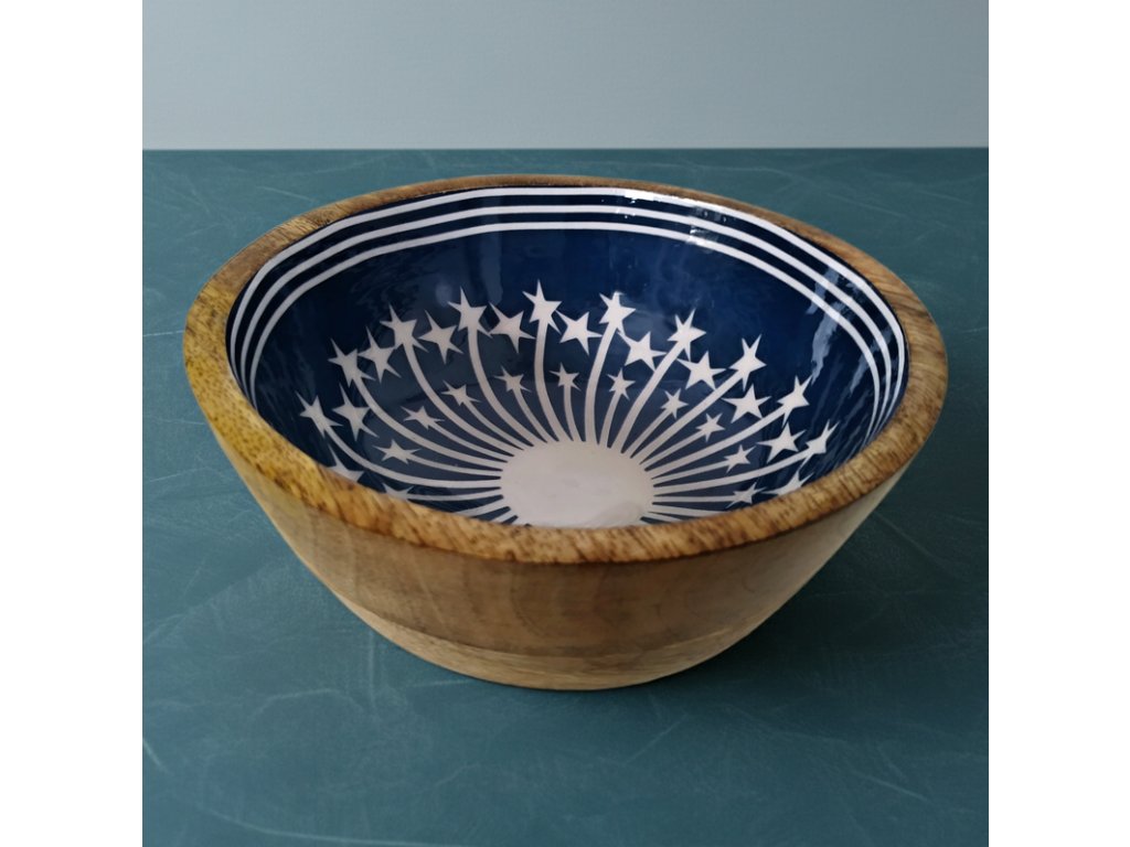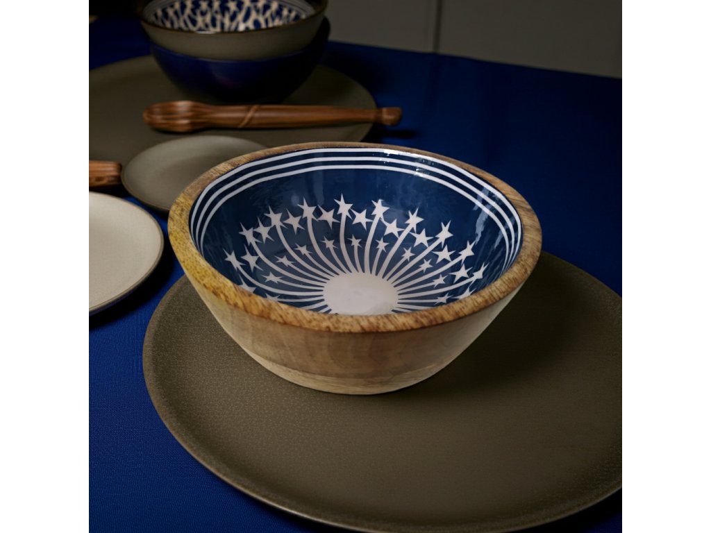 Dřevěná servírovací miska je stylový a praktický doplněk vyrobený z přírodního mangového dřeva , který vnáší do interiéru hřejivou a přirozenou atmosféru. Mísa o rozměrech 15 × 8 cm se výborně hodí jako servírovací TALÍR či MÍSA na pevné potraviny a pochutiny, stejně tak jako na podložka pod svíčky, šperky, klíče, kosmetiku či drobné sezónní dekorace. Vnitřní povrch zdobí fóliový dekorativní vzor, který vytváří decentní kontrast vzorových detailů s přírodním odstínem dřeva. Každý kus je originál, díky čemuž podnos působí autenticky a jedinečně. Vynikne na stole, komodě v obýváku, konzolovém stolku v předsíni či nočním stolku v ložnici. Servírovací podnos z mangového dřeva tak spojuje estetiku a funkčnost v jednom – jako praktický tác i jako dekorace s osobitým charakterem.
