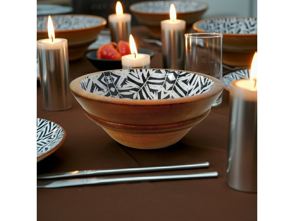 Dřevěná servírovací miska je stylový a praktický doplněk vyrobený z přírodního mangového dřeva , který vnáší do interiéru hřejivou a přirozenou atmosféru. Mísa o rozměrech 17 × 7 cm se výborně hodí jako servírovací TALÍR či MÍSA na pevné potraviny a pochutiny, stejně tak jako na podložka pod svíčky, šperky, klíče, kosmetiku či drobné sezónní dekorace. Vnitřní povrch zdobí fóliový dekorativní vzor, který vytváří decentní kontrast vzorových detailů s přírodním odstínem dřeva. Každý kus je originál, díky čemuž podnos působí autenticky a jedinečně. Vynikne na stole, komodě v obýváku, konzolovém stolku v předsíni či nočním stolku v ložnici. Servírovací Mísa z mangového dřeva tak spojuje estetiku a funkčnost v jednom – jako praktický tác i jako dekorace s osobitým charakterem.