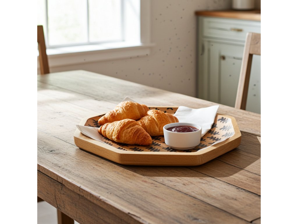 Dřevěný servírovací podnos je stylový a praktický doplněk vyrobený z přírodního mangového dřeva , který vnáší do interiéru hřejivou a přirozenou atmosféru. Podnos o rozměrech 26 × 26 cm se výborně hodí jako servírovací TALÍR či MÍSA na pevné potraviny a pochutiny, stejně tak jako na podložka pod svíčky, šperky, klíče, kosmetiku či drobné sezónní dekorace. Vnitřní povrch zdobí fóliový dekorativní vzor, který vytváří decentní kontrast vzorových detailů s přírodním odstínem dřeva. Každý kus je originál, díky čemuž podnos působí autenticky a jedinečně. Vynikne na stole, komodě v obýváku, konzolovém stolku v předsíni či nočním stolku v ložnici. Servírovací podnos z mangového dřeva tak spojuje estetiku a funkčnost v jednom – jako praktický tác i jako dekorace s osobitým charakterem.