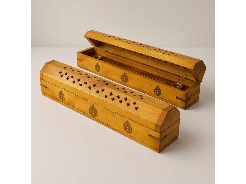 Krásnáručně vyráběná, dřevěná truhlička - Box, zdobená mosaznými intarziemi - Řezbovaná s odklápěcím víkem. Vhodné na pálení vonných tyčinek nebo na vonné kužílky v mosazné misce.