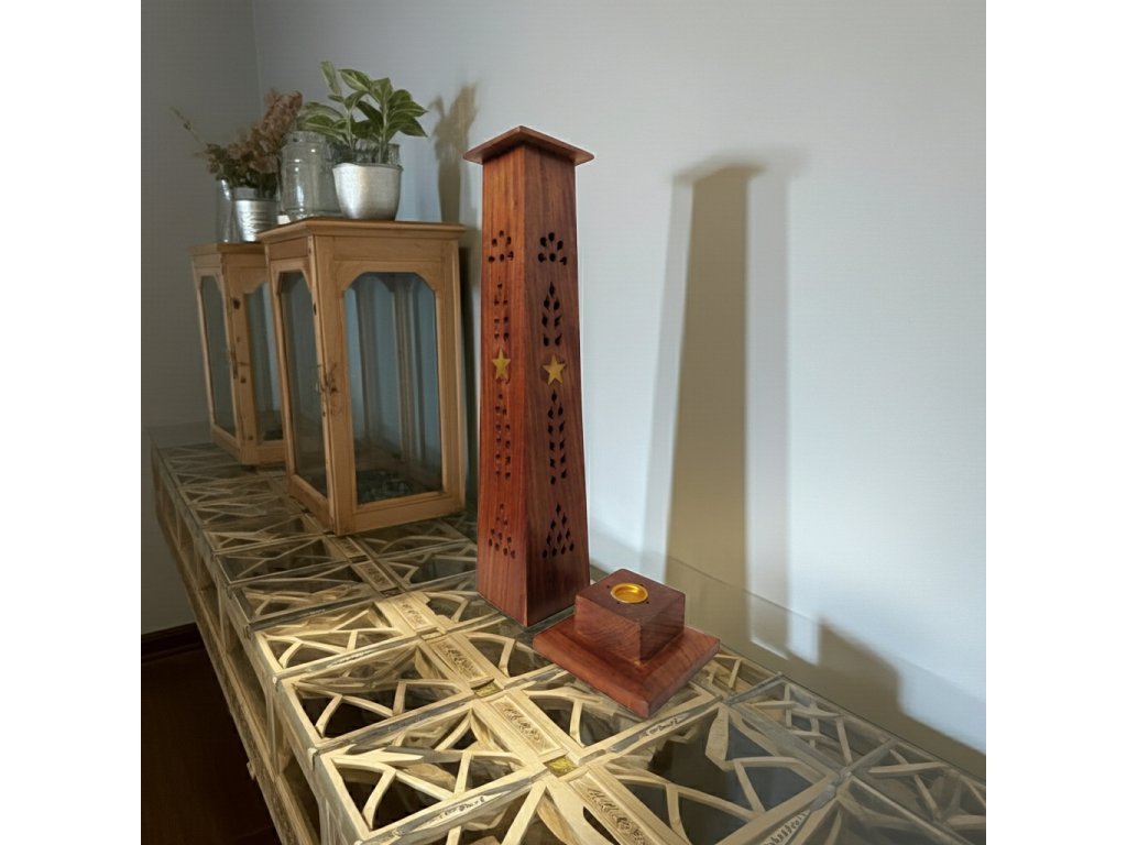 Krásnáručně vyráběná, krásně zdobená dřevěná řezbovaná Věž s intarziemi. Vhodné na pálení vonných tyčinek a kuželů. Lze použít i jako originální dekoraci do interiéru, na parapet, polici, balkon apod.